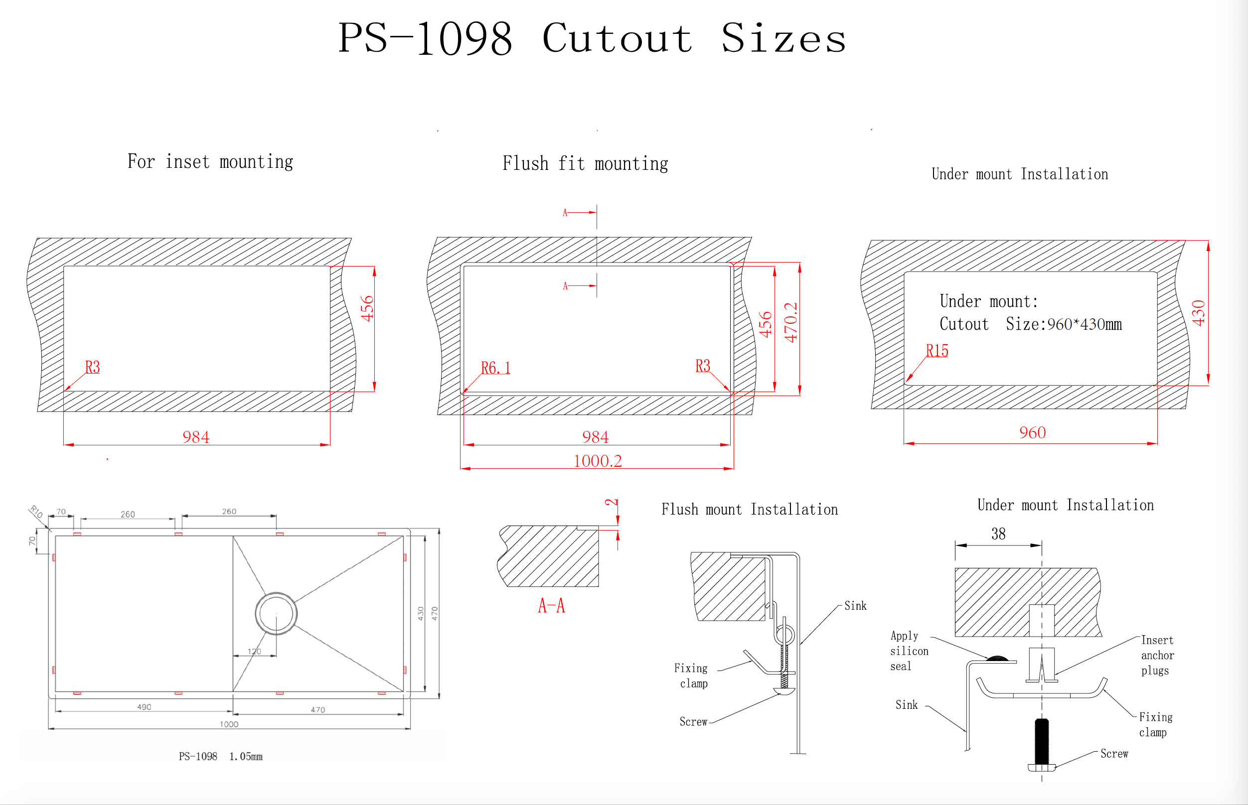 Both flush installation and under-mounted are available. SS304, Flat and straight edge.